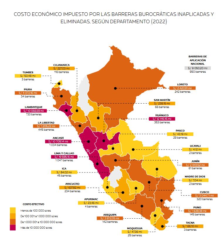 De acuerdo con el Indecopi “la cifra de S/ 82.1 millones representó un incremento del costo económico de las barreras burocráticas inaplicadas o eliminadas de 70% comparado con el 2021, debido a un mayor número de barreras burocráticas analizadas en general durante el 2022″.