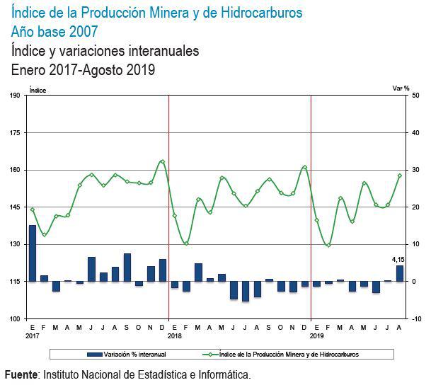 El resultado de agosto fue impulsado por la recuperación del sector minería e hidrocaburos que creció en 4.15%, la tasa más alta en 17 meses. Fue la mayor actividad del subsector hidrocarburos en que creció en 38.2% la que permitió esta expansión, explicado por la mayor extracción de gas natural (58,2%), líquidos de gas natural (34.7%) y petróleo crudo (27.7%).