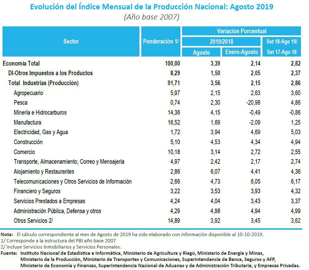 La dinámica de la actividad económica en agosto último tuvo una ligera recuperación y logró su tasa de crecimiento más alta del 2019. Según el Instituto Nacional de Estadística e Informática (INEI) el producto bruto interno en el octavo mes del año creció en 3.39%.