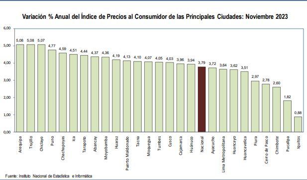 El IPC a nivel nacional en el mes se contrajo 0.26% en noviembre último. De hecho, se presentaron variaciones negativas en 19 de las 26 ciudades, principalmente en Tumbes (-1.33%), Chiclayo e Iquitos con -1.04% cada una.
