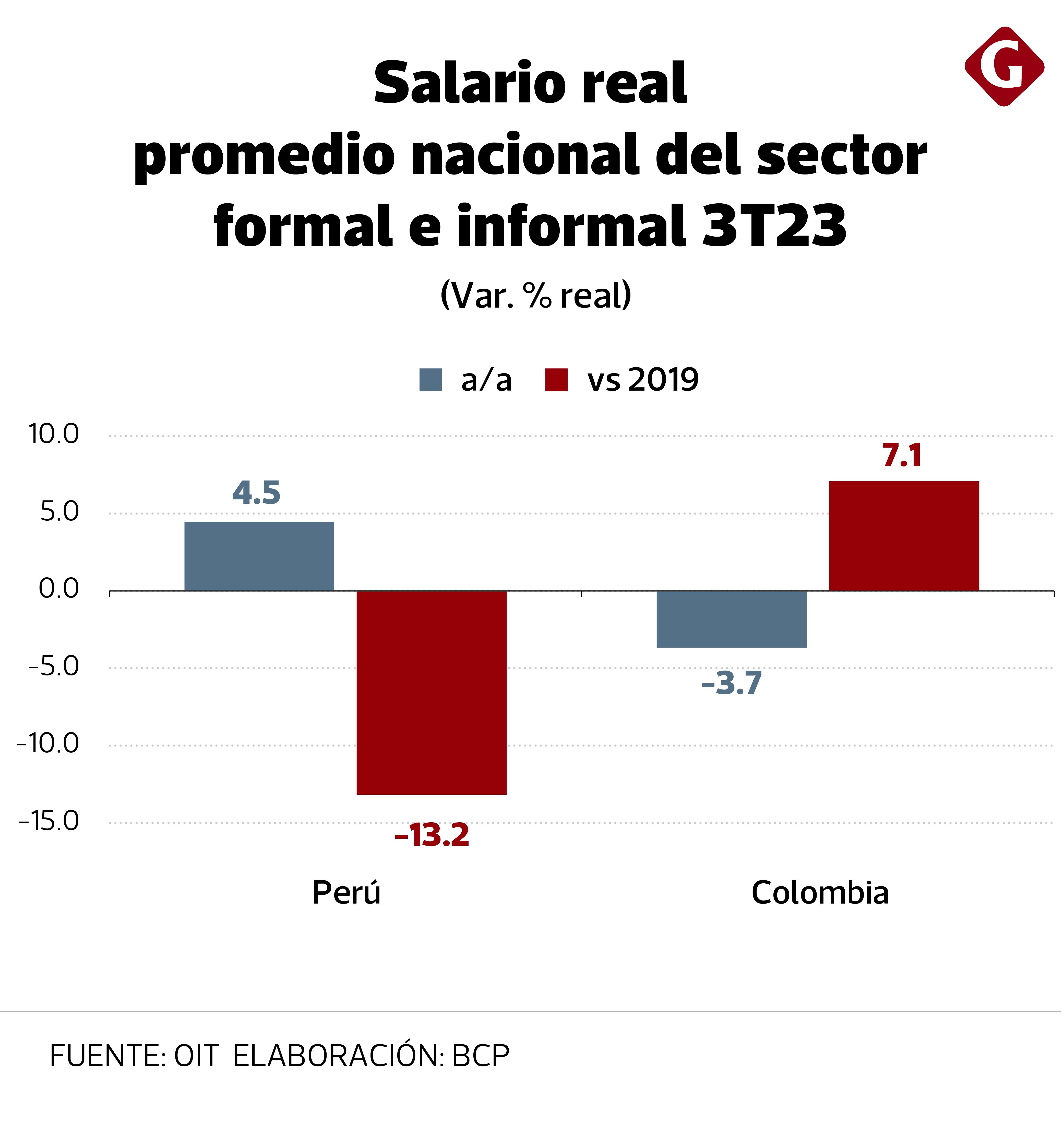 Prieto explica que si se comparan los salarios reales de Perú y Colombia del sector formal e informal del tercer trimestre, en el primer caso se encuentran 13.2% por debajo del 2019, mientras que los del país vecino están 7.1% por encima.