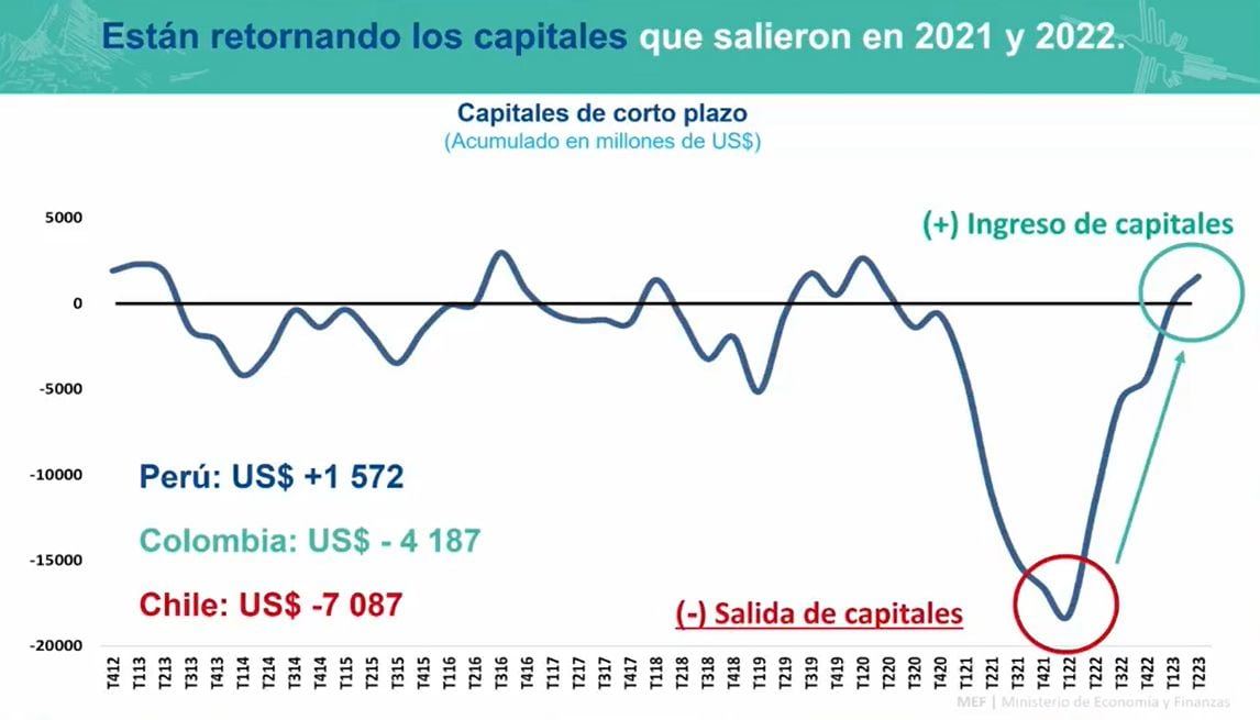El Ministerio de Economía y Finanzas (MEF) indicó que al Perú están retornando los capitales que salieron en el 2021 y 2022 por la inestabilidad política que se vivió durante esos años.