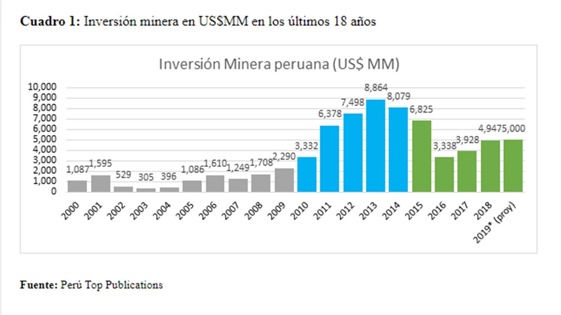 La inversión en ese sector -según Perú Top Publications- podría alcanzar US$ 5,000 millones al 2019 (a inicios de año se hablaba de US$ 6,000 millones), incluyendo inversiones en proyectos y en minas activas, pero la tendencia es a la baja por temas locales (conflictos sociales, tramitología), y globales (la guerra comercial entre Estados Unidos y China ejerce presión sobre la cotización del cobre y el futuro económico de nuestros dos principales socios comerciales).