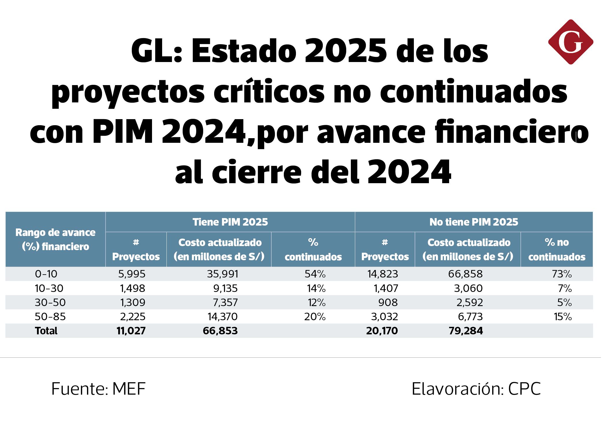 En este contexto, si bien actualmente hay 37,700 proyectos que no han sido continuados, estos deben ser reincorporados estratégicamente en el transcurso del año, priorizando aquellos proyectos críticos, aquellos con una ejecución financiera menor al 85% (22,625 proyectos), en lugar de incorporar nuevos proyectos.
