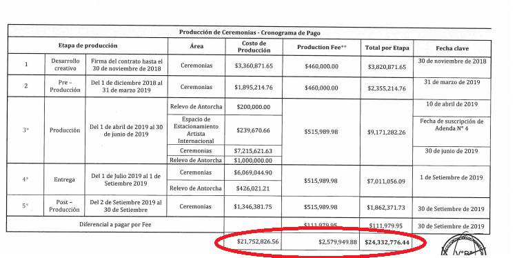 ¿Cómo se dividió este costo? Sin incluir IGV, se destinaron US$ 21.7 millones para los costos de producción (luces, escenarios, actores, vestuarios, etc). Mientras que los honorarios de la empresa Balich Worldwide Shows por las cuatro ceremonias fue de US$ 2.5 millones, los cuales aún no han sido desembolsados plenamente y se concretarían en setiembre, según el cronograma de la adenda 4 del contrato al que se accedió.