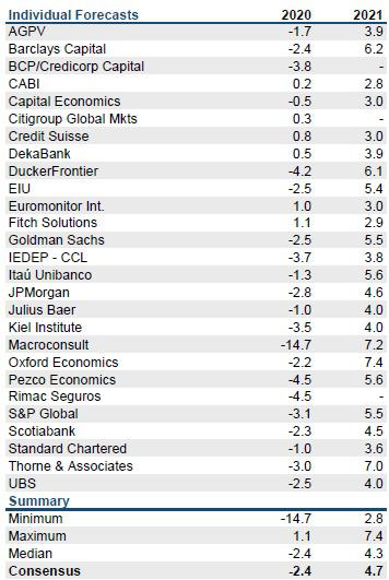 “La perspectiva del país se redujo este mes, a medida que el consumo privado, la inversión fija y las exportaciones se contraerán este año debido a la pandemia del Covid-19”, dijeron los panelistas, que esperan una recuperación del PBI en el 2021. “El año que viene, la economía debería recuperarse de forma sólida, creciendo un 4.7%”.