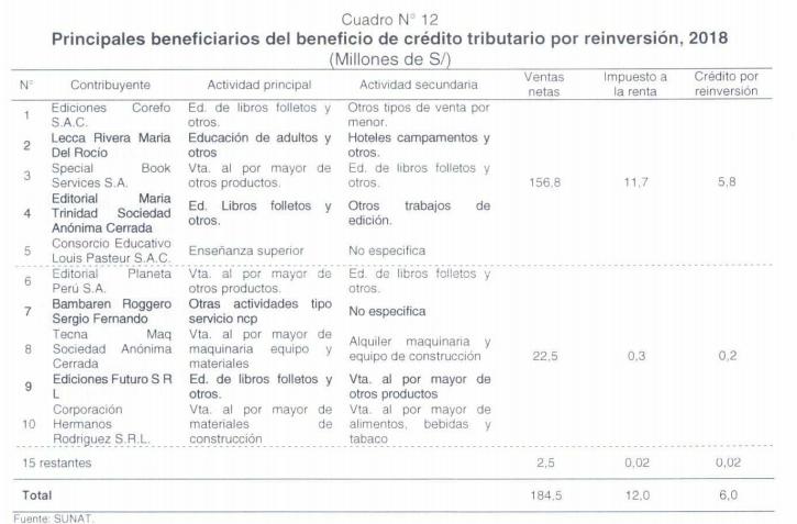 Por otra parte, el 96% del crédito tributario por reinversión fue solicitado por 5 empresas durante el año 2018. Las 5 empresas que obtuvieron un mayor beneficio fueron Ediciones Corefo SAC, Lecca Rivera María del Rocío, Special Book Services S.A, Editorial María Trinidad SAC y el Consorcio Educativo Luis Pasteur SAC.