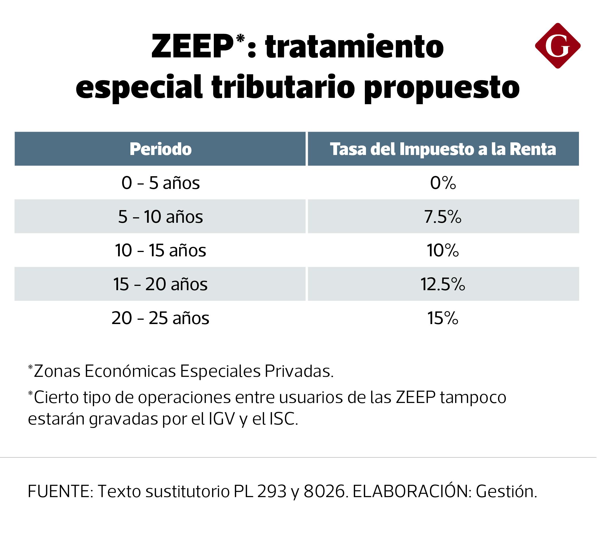 La propuesta legislativa zanja, luego de opiniones diversas en torno a la aplicación del Impuesto a la Renta (IR) en estos espacios, que los operadores y usuarios de las ZEEP iniciarían con una tasa del 0% para este tributo.