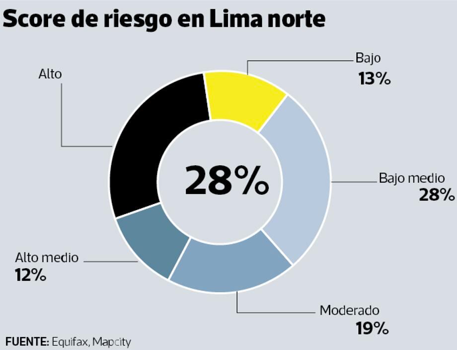 Pero también concentra el mayor porcentaje de población con alto riesgo de incumplir con el pago de sus deudas. Según Equifax, el 40% de la población de Lima norte cuenta con un score de riesgo alto (28% con riesgo alto y 12% con un riesgo medio alto).