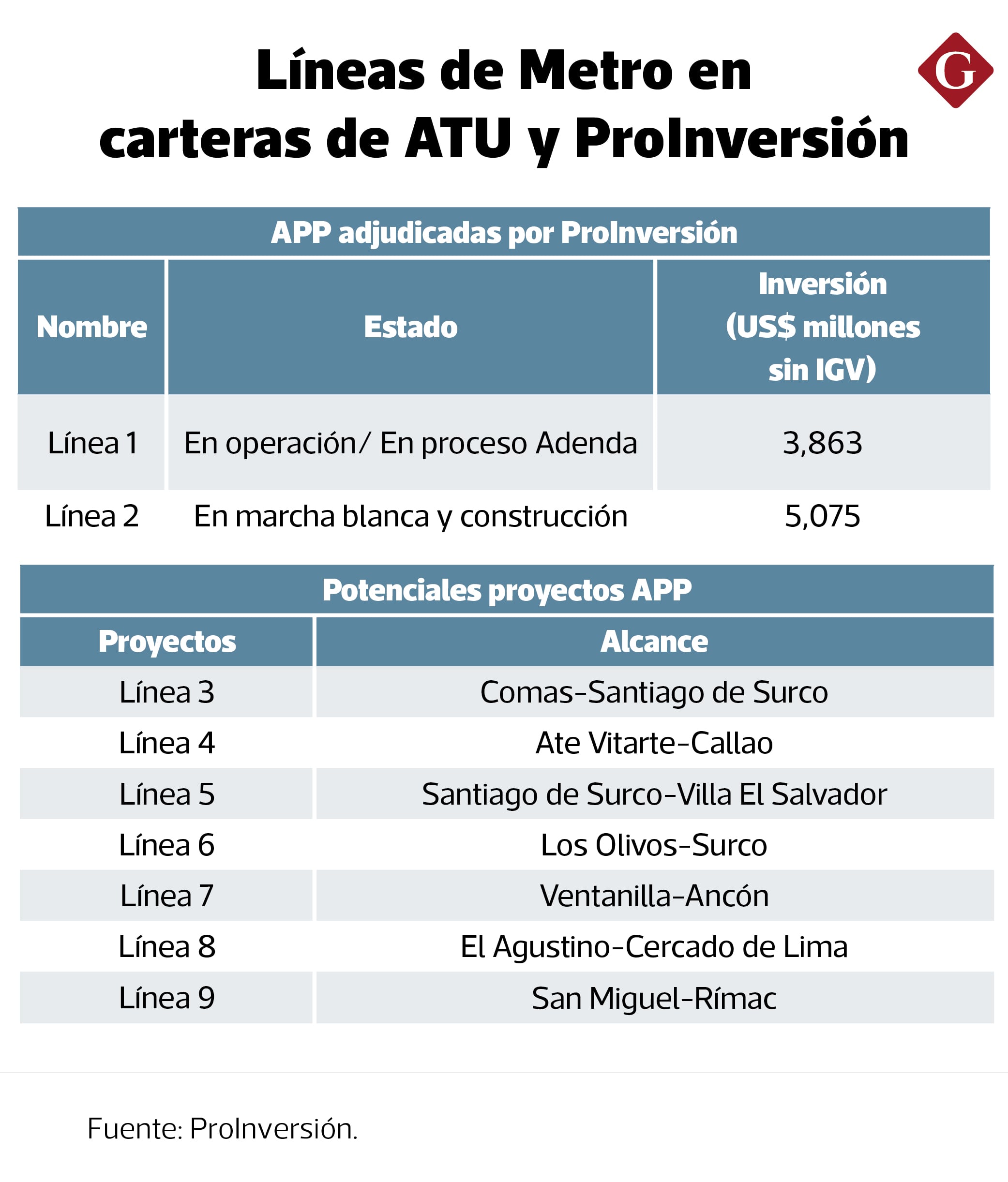 En una aclaración posterior, ProInversión precisó a Gestión que la Línea 3 y la 4 se promoverán paralelamente, pero no se adjudicarán como una sola APP conjunta, si no separadas. Ambas sí serán cofinanciadas, al igual que ocurre con la Línea 1 y la 2, donde el Estado asume parte de su costo.