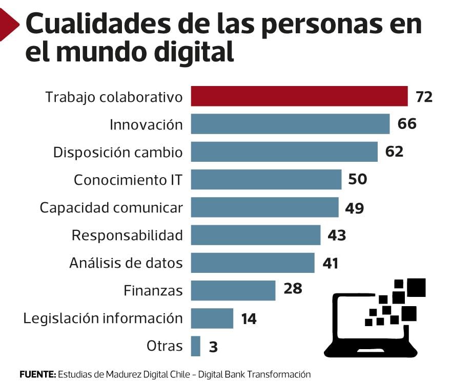 Según datos de Digital Bank Transformation, las cualidades más valoradas en el mundo digital son trabajo colaborativo, innovación y disposición de cambio.