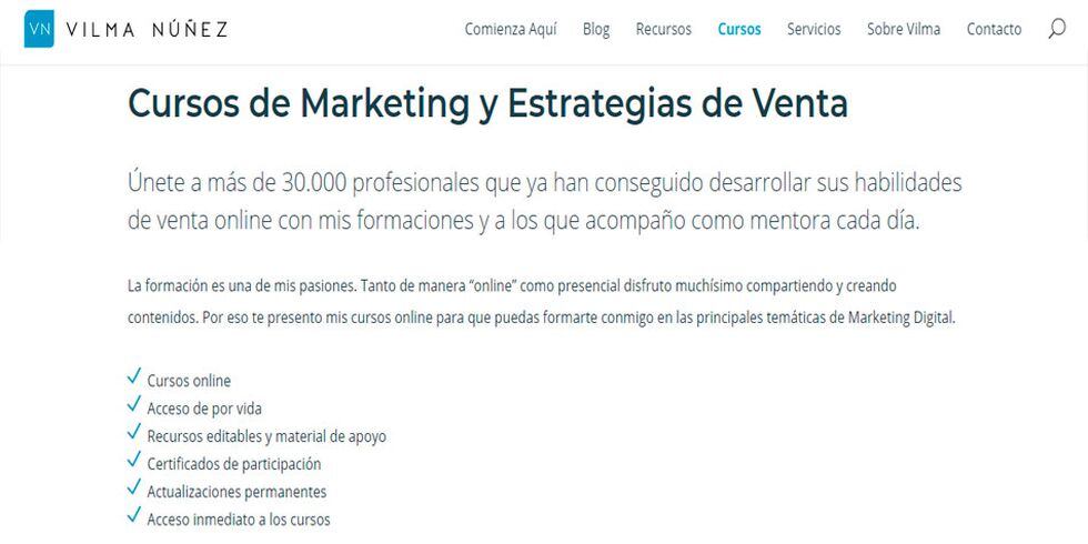 La web Vilma Núñez es el espacio perfecto para los amantes del Marketing Digital. Algunos de los cursos gratis online se pueden impartir desde este sitio web. Aquí llevarás cursos básicos de Facebook Ads, curso online de Inbound y Content Marketing. La mayor parte de estos cursos requieren de un pago mínimo, aunque puedes encontrar cursos gratuitos de marketing digital de gran valor.