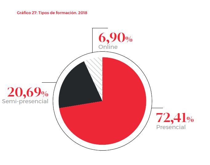 Cabe precisar que el “Barómetro DCH de la Gestión del Talento del Talento en Perú” realizado por la Maestría en Organización y Dirección de Personas de ESAN y EAE Business School, revela que las empresas peruanas valoran más la formación presencial de los trabajadores (72.41%), seguido de la semipresencial (20.69%) y online (6.90%).