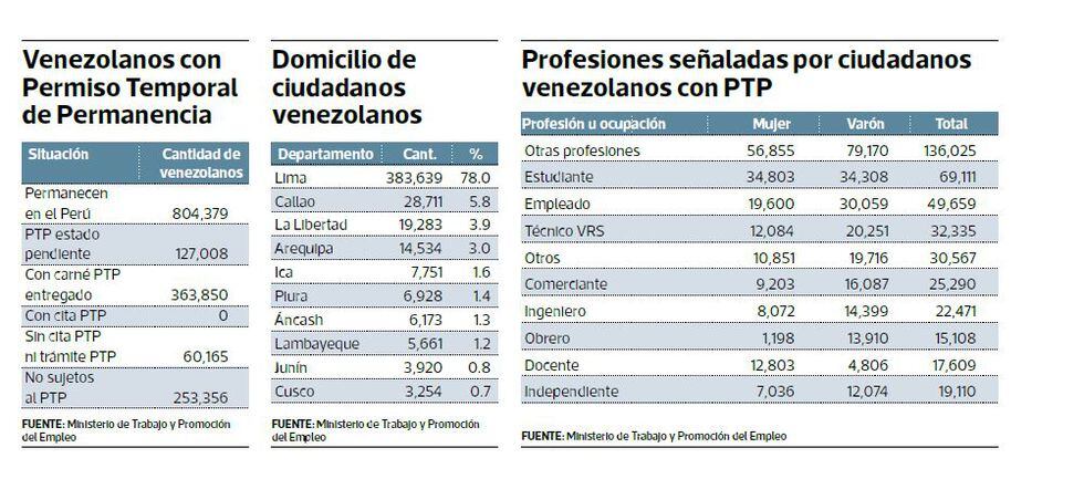 El MTPE detalló que los 804,379 ciudadanos venezolanos que permanecen en territorio peruano, no todos se encuentran en edad de trabajar (menores de 18 años y otros), ni tampoco están habilitados para trabajar, ya que dependen de su condición migratoria como el PTP, entre otros.