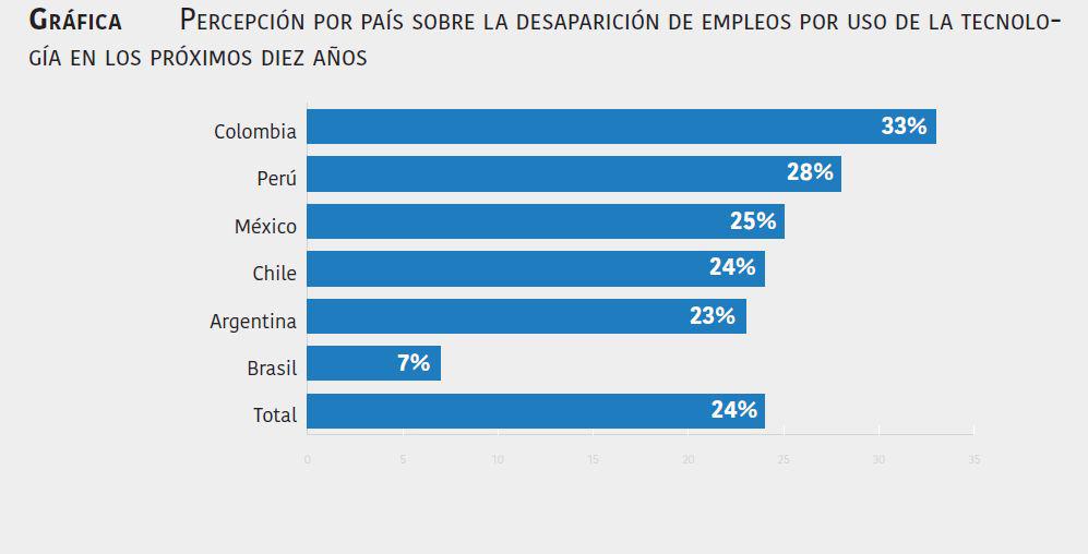 Perú es uno de los países en donde existe una mayor percepción (28%) de que varios empleos desaparecerán por la adopción de la tecnología, en contraste con Brasil, en donde la percepción es de apenas 7%.