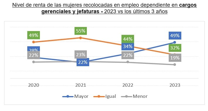 En el 2023, el nivel de renta en recolocación de empleo dependiente en mujeres fue de 49%, mientras que en el 2022 alcanzó 34% y en el 2021 fue de 22%.