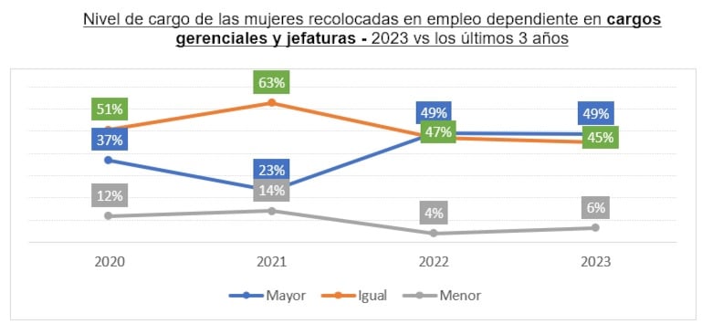 El estudio indicó que, desde el 2021, se observa una tendencia al alza en mejores salarios para las mujeres recolocadas en cargos de gerencia y/o jefaturas.