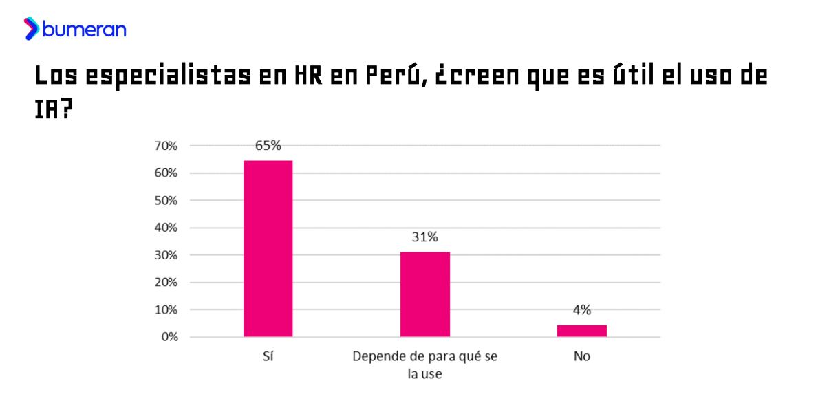 De acuerdo con el estudio “IA en el trabajo ¿qué tan útil es?”, de Bumeran, el 65% de especialistas en RR.HH. del Perú considera útil el uso de la inteligencia artificial.