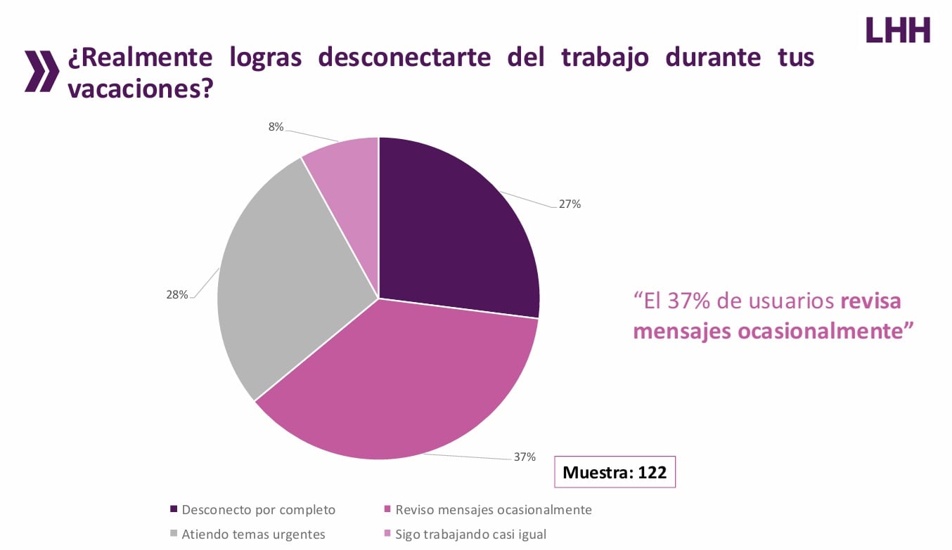 Un sondeo realizado por la consultora LHH Perú muestra que solo uno de cada tres trabajadores logra desconectarse por completo en vacaciones (27%). Asimismo, un 8% sostiene que a pesar de estar de vacaciones, sigue trabajando “casi igual” (ver cuadro).