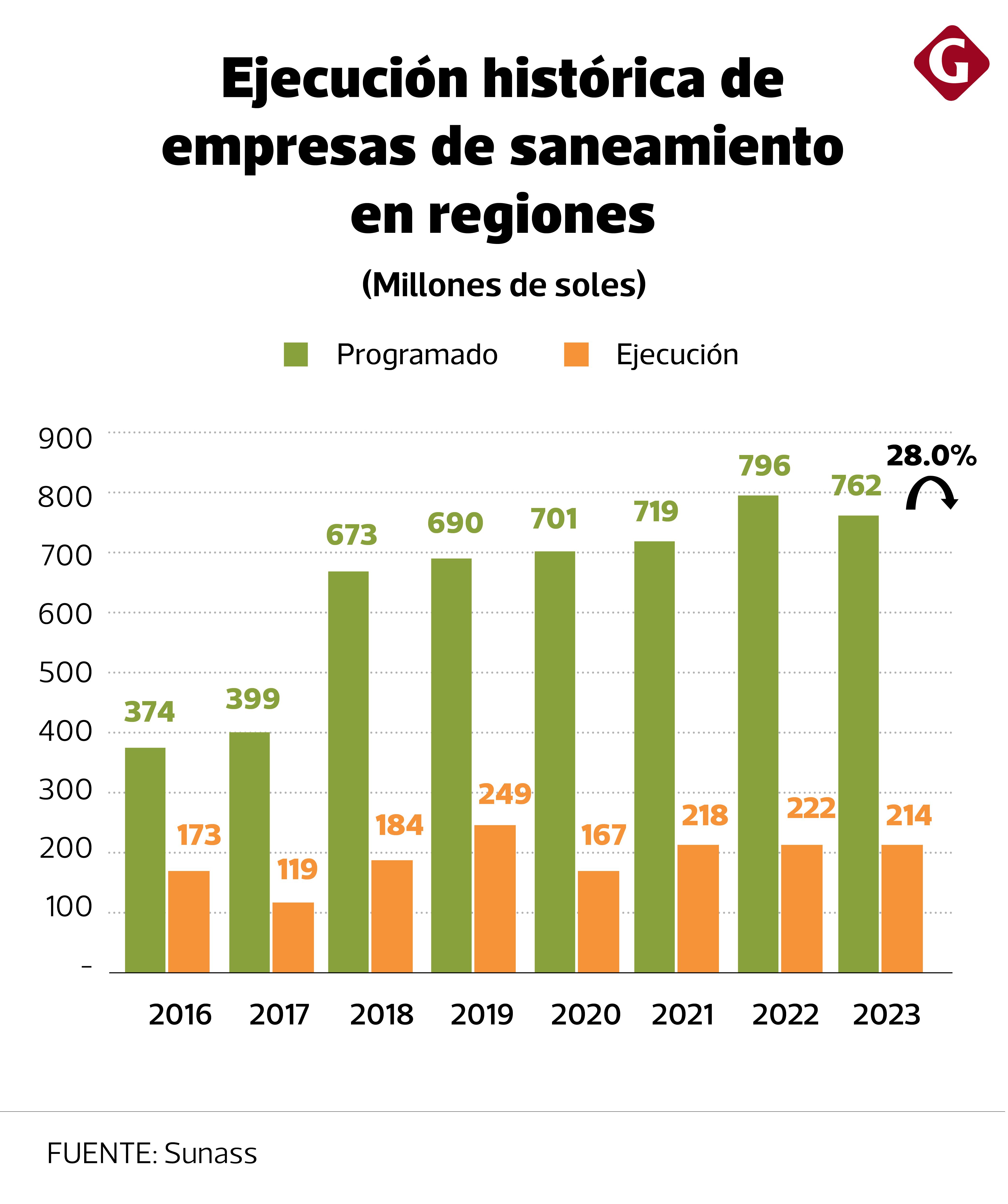 Como parte del análisis, en el caso de inversiones totales, el promedio de ejecución de las EPS, sin incluir Sedapal, en el periodo 2016-2023 es de 30%. En 2023, el promedio estuvo por debajo de ese histórico: 28%.