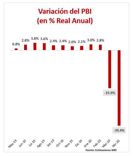 En un análisis realizado por la Dirección General de Política Macroeconómica y Política del Ministerio de Economía y Finanzas (MEF), al que accedió Gestión, la situación que enfrenta la economía es una caída de 19.9% y 39.4% del PBI en los meses de marzo y abril, respectivamente.