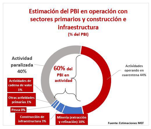 Con ello, si se decide reiniciar la actividad minera, ésta podría pasar del 19% actual a 85%, considerando que actualmente solo operan las actividades críticas y de mantenimiento. En el caso de la pesca, pasaría de 36% a 48%, mientras que la construcción pasaría de su total parálisis a un 53% de operatividad.