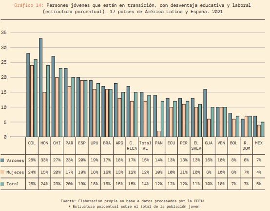 De igual forma un 11% (15,6 millones) del total de jóvenes latinoamericanos está trabajando sin certificado de estudios básico, es decir, se estabilizaron laboralmente, pero no completaron la educación secundaria. Y casi 20 millones, un 14%, no terminaron la educación secundaria y tampoco completaron la transición laboral.
