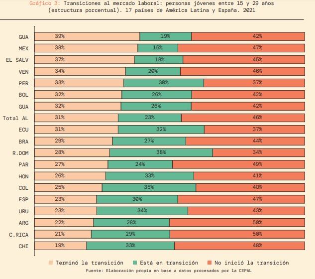 Este estudio contrasta las desigualdades en 17 países de América Latina y España. Para definir “la transición” toman la definición de la Organización Internacional del Trabajo (OIT), que establece que este proceso es “el paso de un/a joven desde el final de la escolarización hasta el primer empleo estable o satisfactorio”.