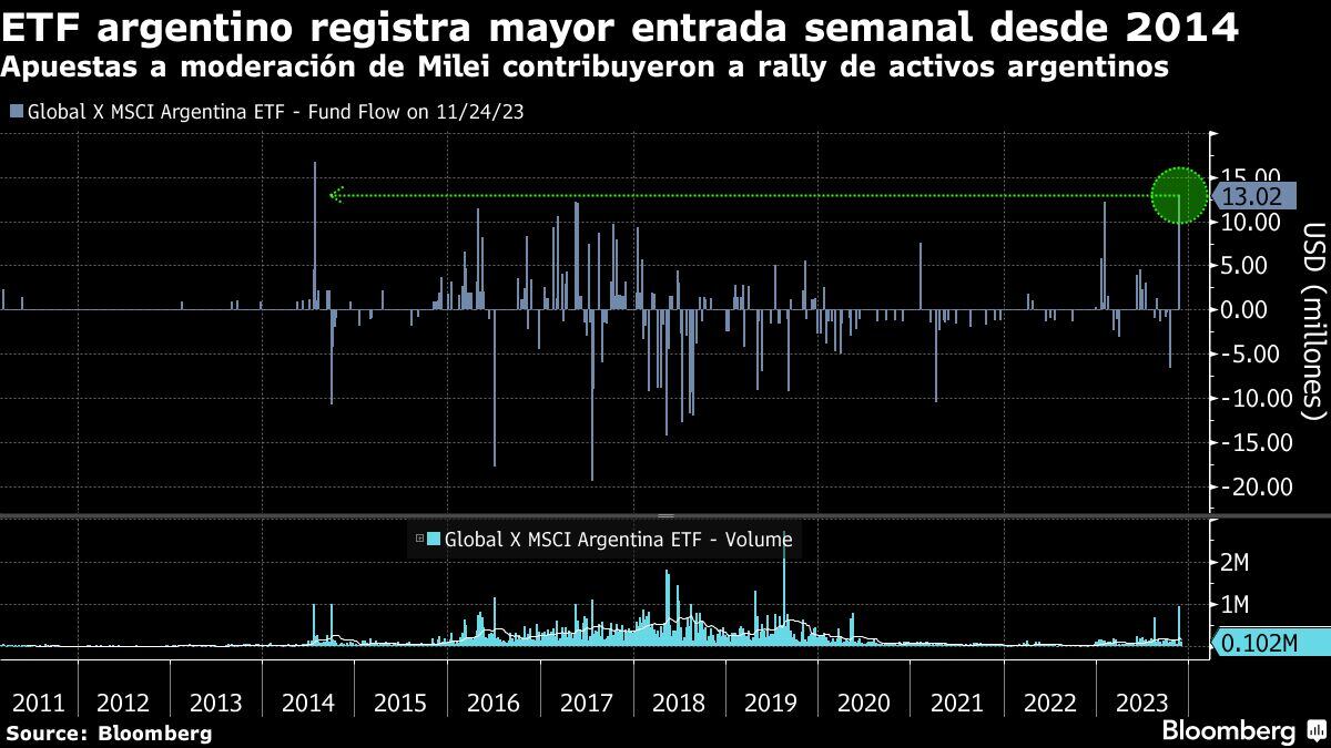Un fondo cotizado en bolsa (ETF, por sus siglas en inglés) que sigue acciones argentinas registró la mayor entrada semanal en nueve años después de que el libertario Javier Milei fuera elegido presidente de la nación sudamericana y luego presentara una postura más moderada antes de asumir el cargo el próximo mes.