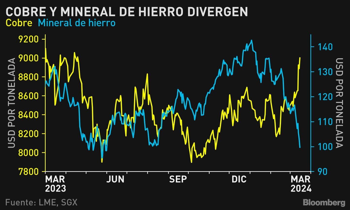 Los precios de dos de las materias primas mineras más importantes del mundo están divergiendo rápidamente: mientras el cobre sube por encima de los US$ 9,000 la tonelada —su nivel más alto en 11 meses—, el mineral de hierro se hunde.