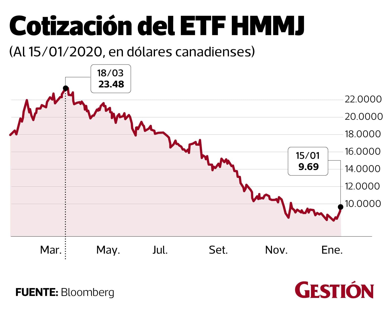 Durante el año pasado, el HMMJ perdió más del 40% de su valor. Incluso la caída fue de casi 60% si se compara con su punto más alto registrado en marzo (22.48 dólares canadienses o US$ 17.20). El 15 de enero pasado, la acción se ubicó en 9.69 dólares canadienses (US$ 7.42).