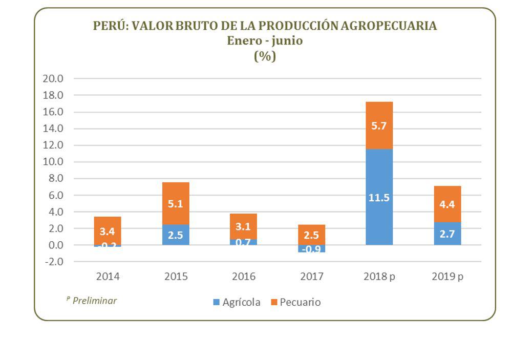 El sector agropecuario acumuló una expansión de 3.3% en el primer semestre del año, en comparación a similar periodo del 2018, de acuerdo al Ministerio de Agricultura y Riego (Minagri).