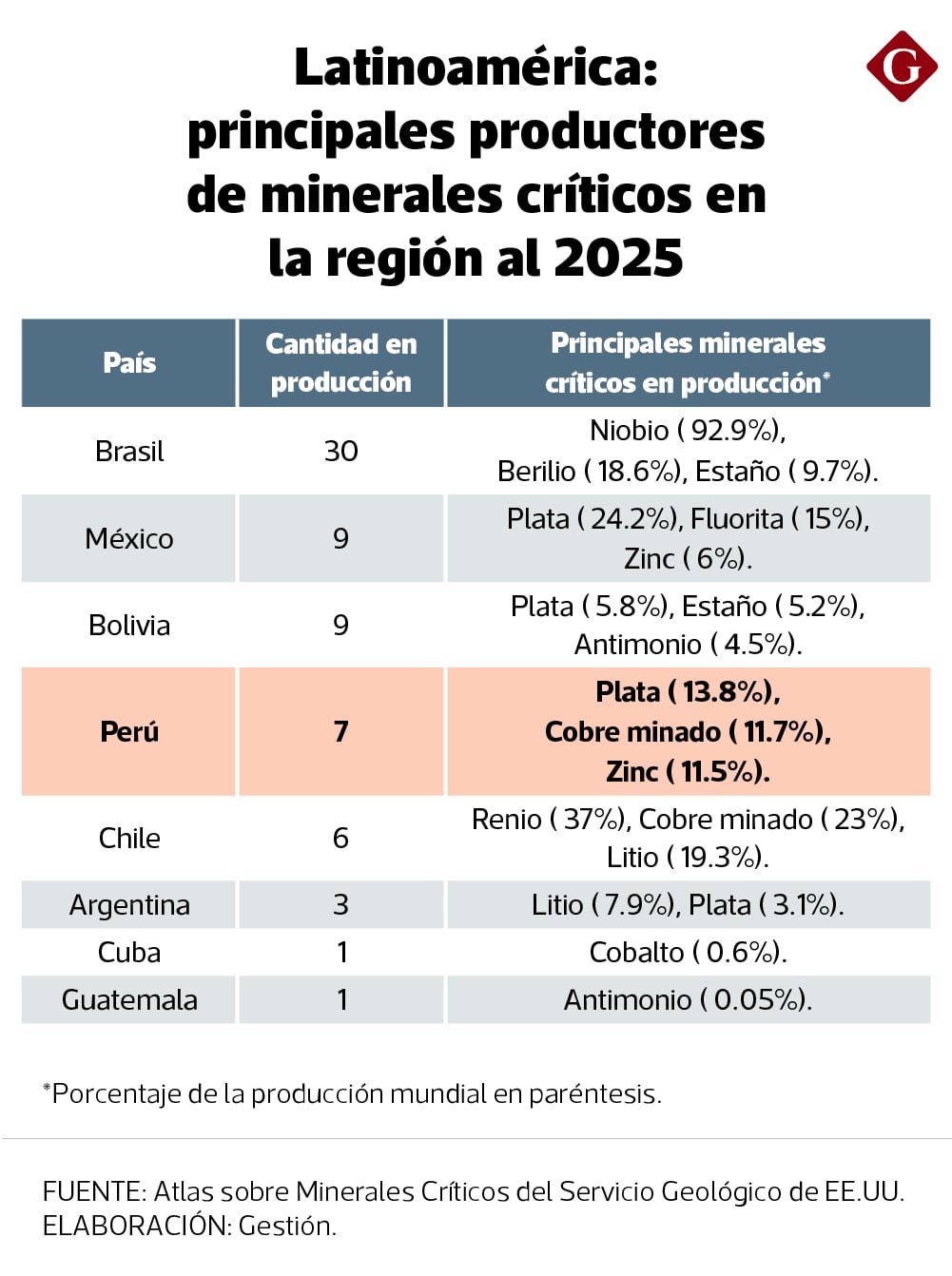 La información de la USGS permite identificar el ranking regional. Perú es el cuarto país latinoamericano que más minerales críticos produce en la región actualmente. El líder absoluto es Brasil, con 30. Aunque, de avanzar en su promoción de proyectos, podría subir puestos en el listado.