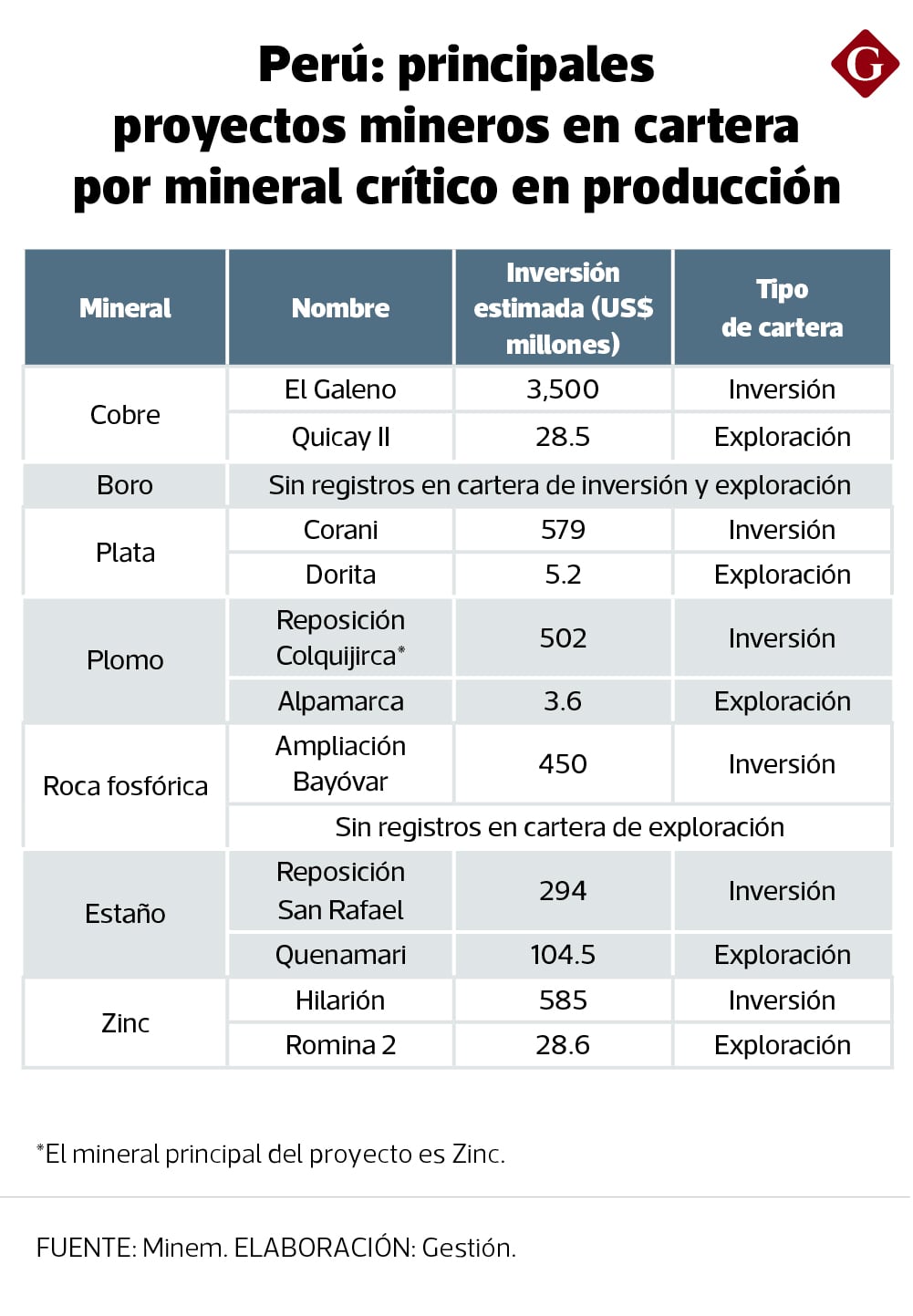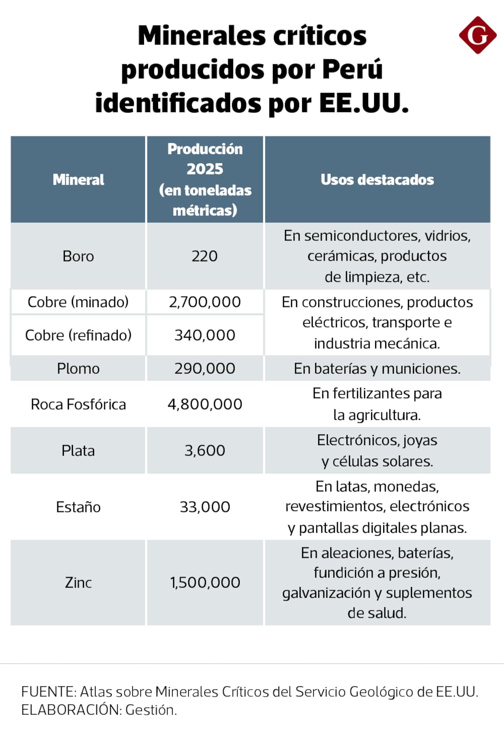 Estos son el boro, cobre (minado y refinado), plomo, roca fosfórica, plata, estaño y zinc. Todos estos están incluidos a la fecha en el Atlas oficial sobre minerales críticos del Servicio Geológico de EE.UU. (USGS, por sus siglas en inglés), organismo gubernamental que se encarga de esta materia.