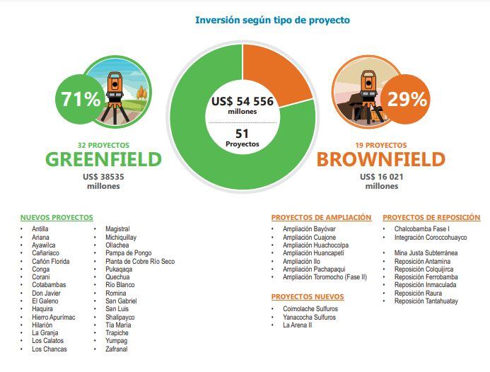 Después de la puesta en marcha de la mina Quellaveco, no se prevé otra iniciativa de gran magnitud para los próximos años. No obstante, el Perú cuenta con 32 proyectos mineros (de los 51 oficiales) de mediana escala tipo greenfield, es decir, nuevos, con una inversión conjunta de US$ 38,535 millones, representando el 70.6% del monto global del portafolio actual del Ministerio de Energía y Minas (Minem).