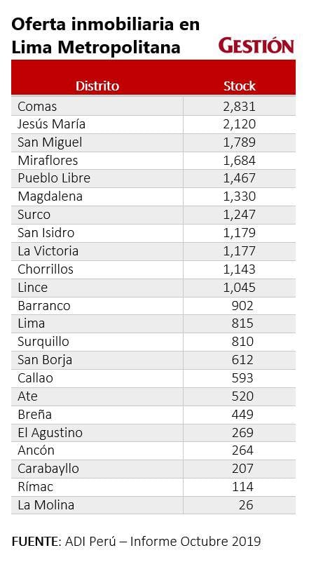 De acuerdo al estudio realizado por ADI Perú, a octubre de este año el distrito de Comas lidera oferta inmobiliaria con un stock de 2,831 unidades disponibles, seguido de Jesús María (2,120), San Miguel (1,789) y Miraflores (1,684).