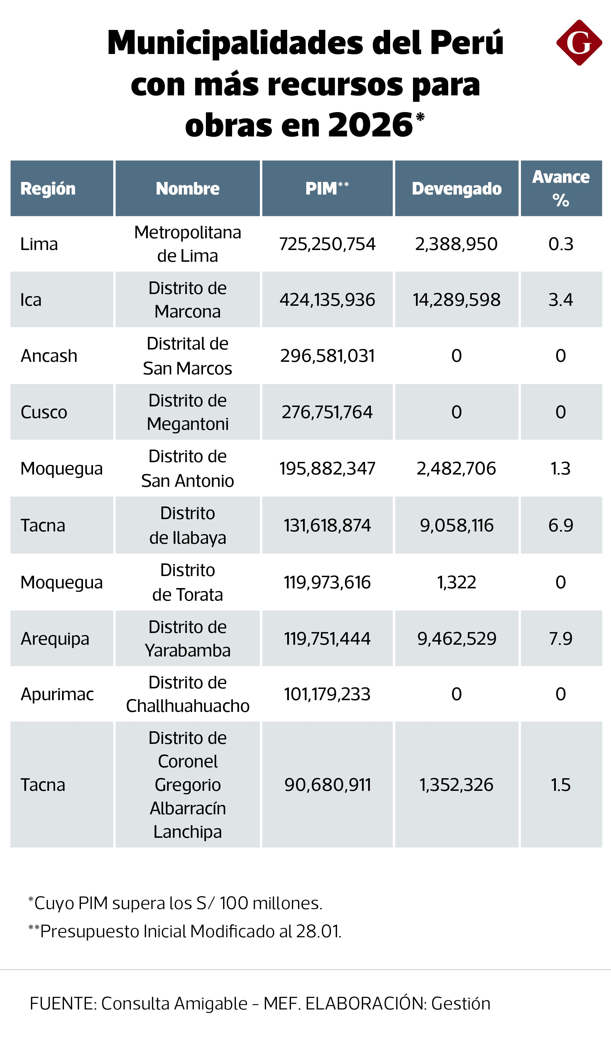En este contexto, Gestión puso el foco en las 10 municipalidades con más recursos para proyectos de inversión en el país. Este “selecto” grupo está compuesto por distritos que superaron los S/ 100 millones de presupuesto en el 2025, y que en 2026 repiten esa cifra.