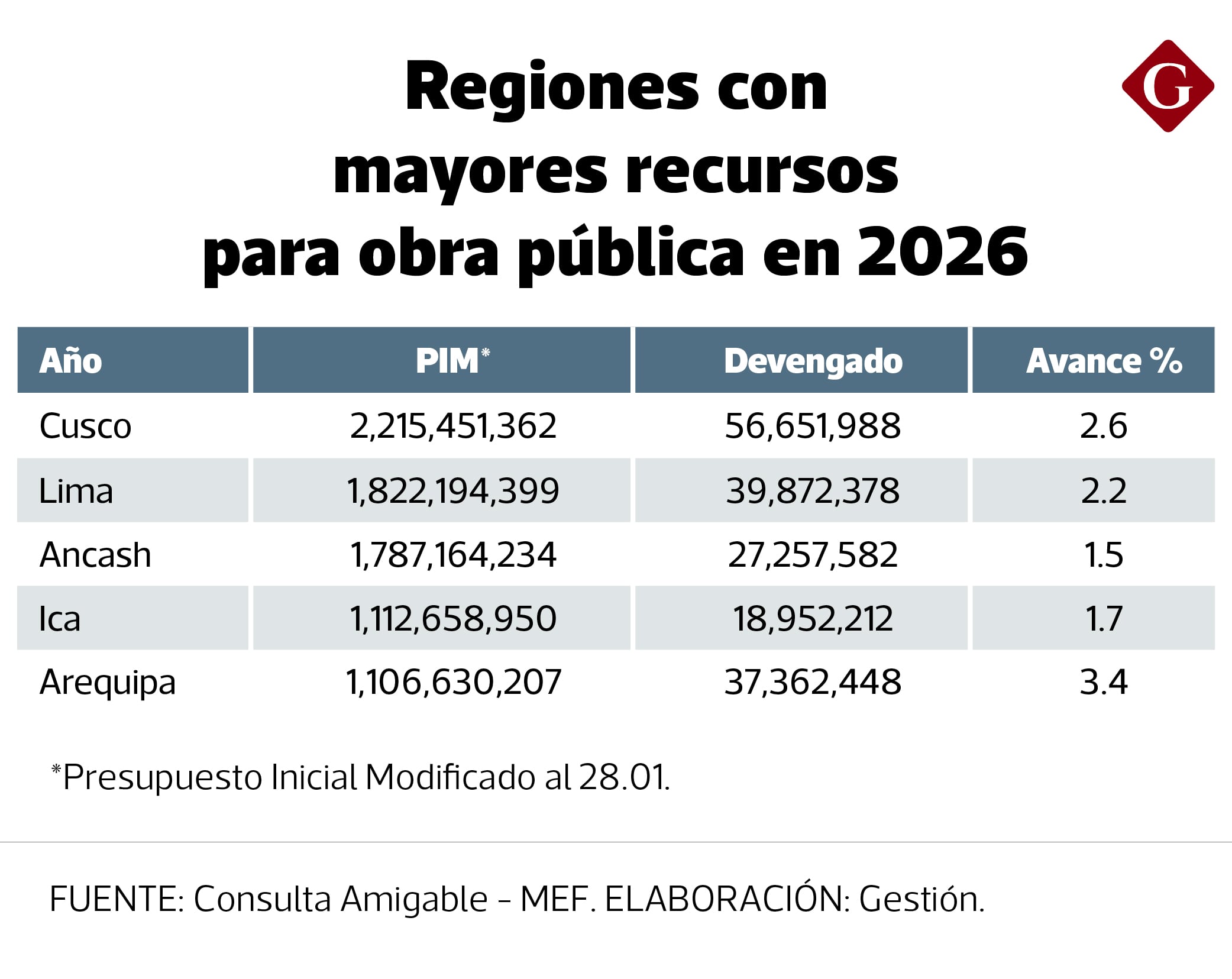 A falta de recibir más recursos, algunos distritos ya sufrieron este impacto en el 2026. Gestión constató que, según el MEF, Marcona tenía S/ 345 millones disponibles para obras al 26 de enero y ya había gastado el 3.8%. Solo 2 días después, el presupuestó creció a S/ 424 millones, lo que redujo su avance a 3.4%.