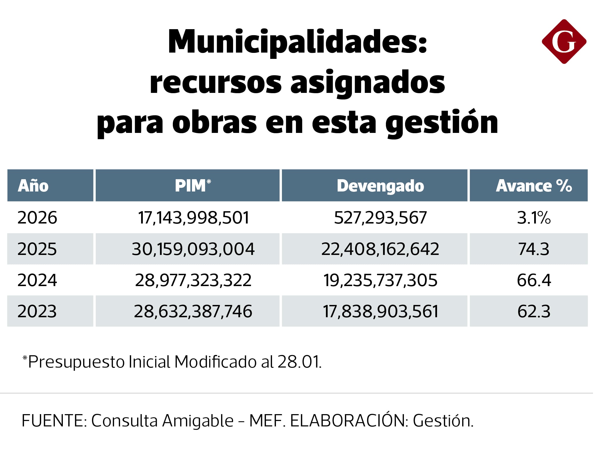 ¿Cómo se ve el panorama para este año? En el 2026, las 1,891 municipalidades -en conjunto- tienen, hasta el 27 de enero, S/ 17,143 millones para proyectos, monto que crecerá en los próximos meses, ya que recibirán transferencias de los recursos provenientes de fuentes como el canon minero o el Fondo de Compensación Municipal (Foncomun). Solo para saber cómo arrancaron el año, vale la pena decir que de este total ya se ejecutó el 3.1% en un solo mes.