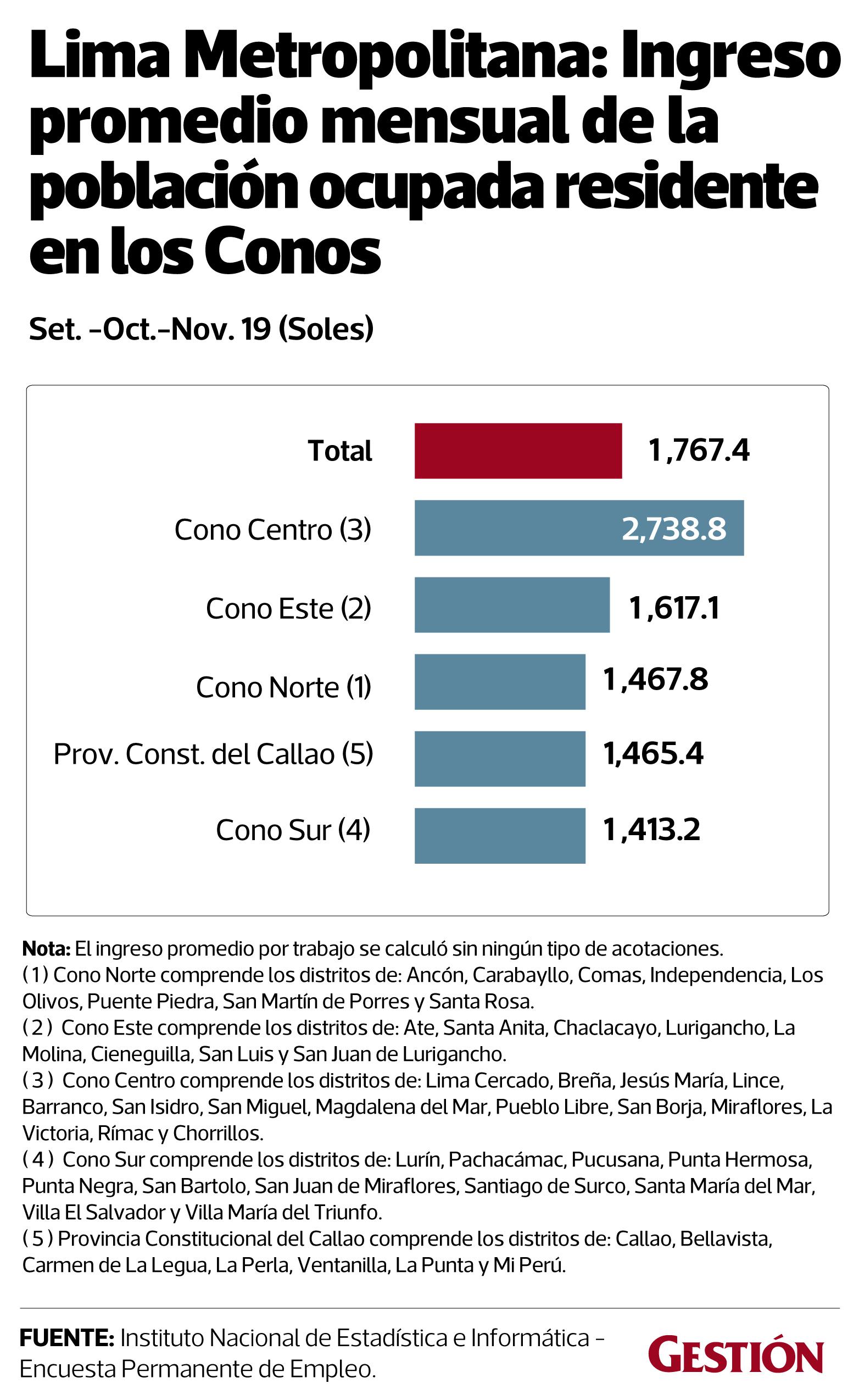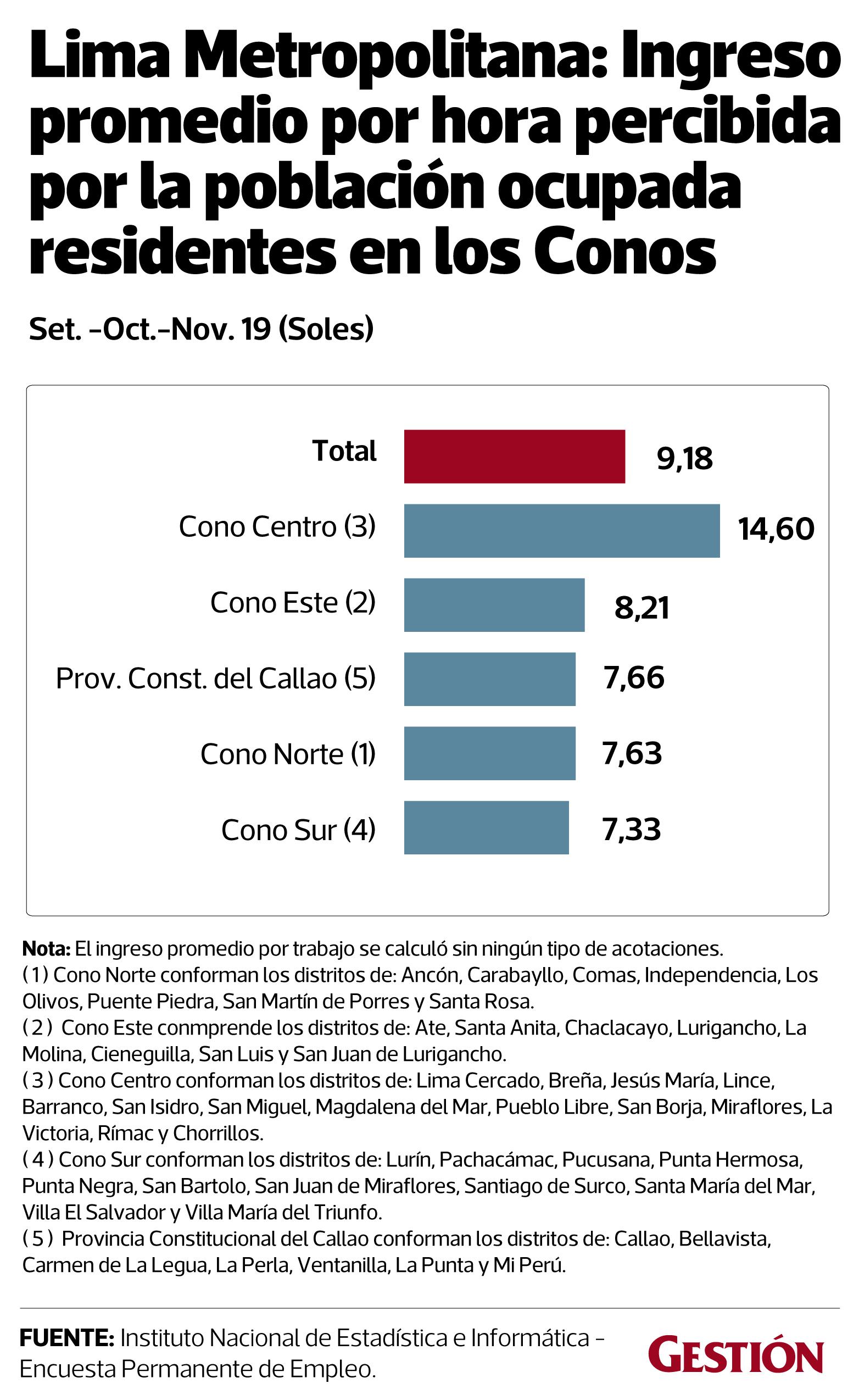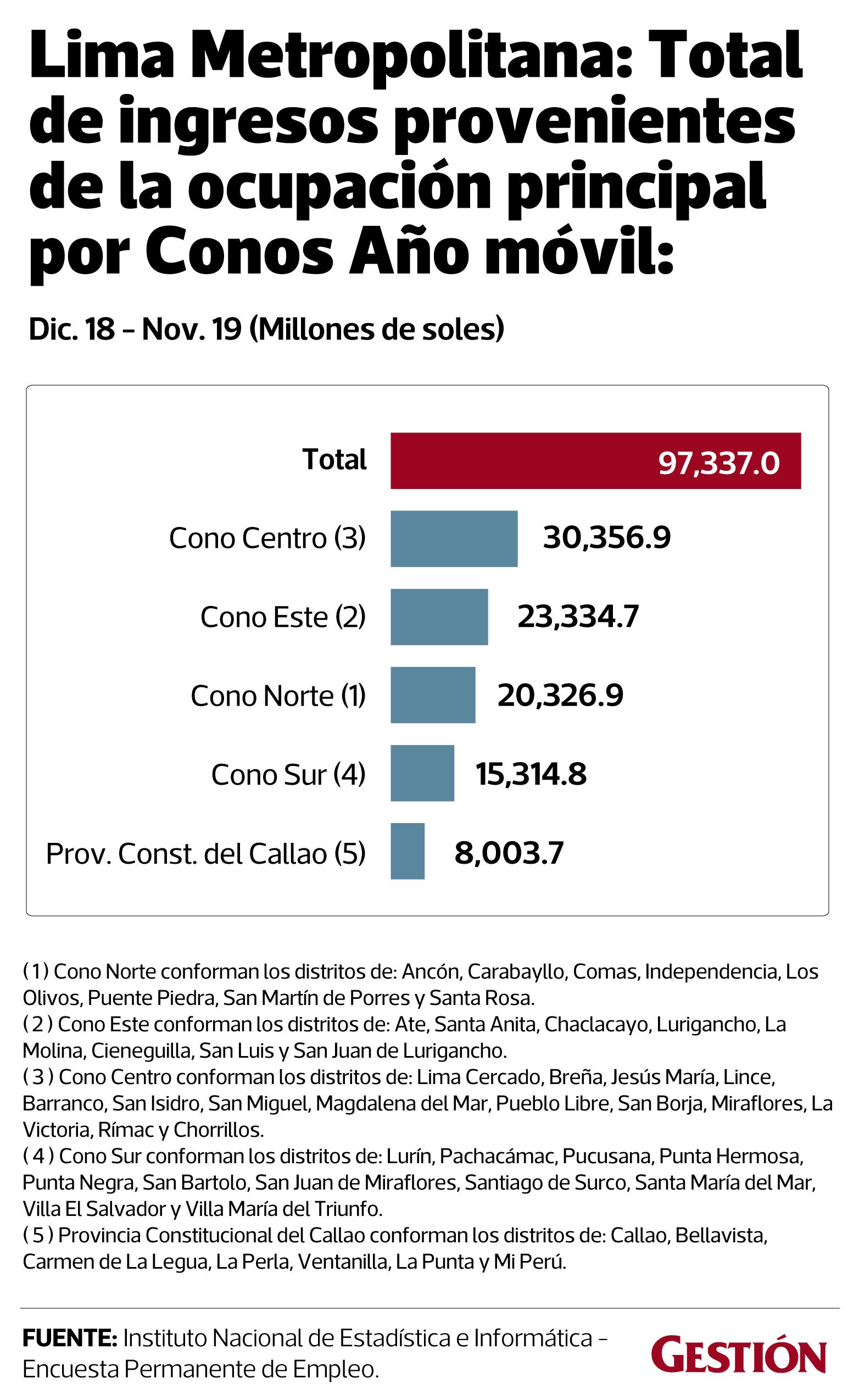 Durante el periodo diciembre del 2018 y noviembre del 2019, el ingreso acumulado por la actividad principal de los trabajadores en Lima Metropolitana es de S/ 97,337 millones, según el último boletín de Situación del Mercado Laboral en Lima Metropolitana del INEI,