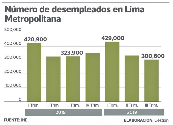 De esta manera, actualmente en la capital peruana existen 300,600 personas que están desempleadas y que buscan empleo activamente, cifra que es 7% menor que los 323,900 personas que tenían esta condición en el mismo periodo del 2018 (ver gráfico).