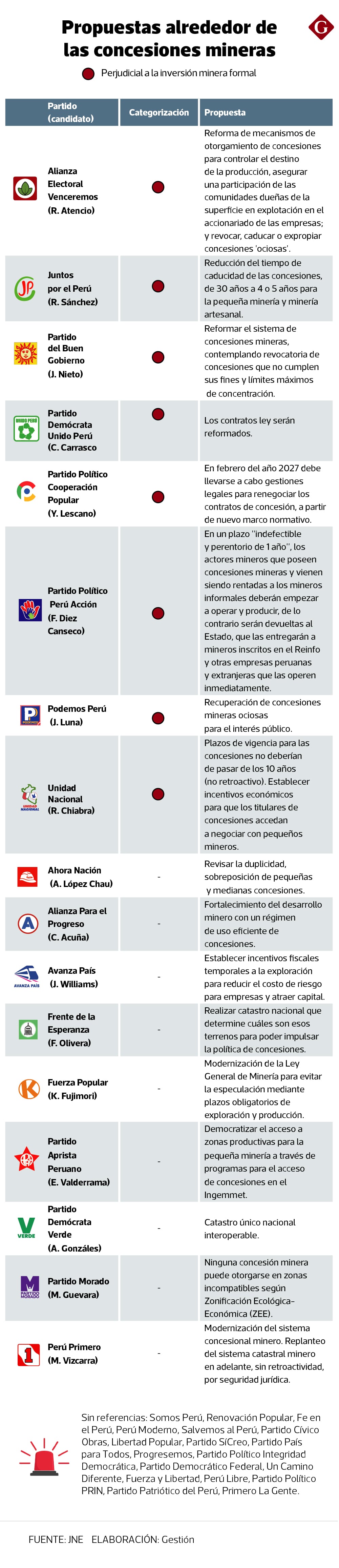 En detalle, son nueve los que tiene propuestas que van alrededor de modernizar la Ley General de Minería con plazos obligatorios de exploración y producción (Keiko Fujimori de Fuerza Popular), considerando el panorama en competidores como Chile o Australia; revisar la duplicidad, sobreposición de pequeñas y medianas concesiones (Alfonso López-Chau de Ahora Nación), entre otros.