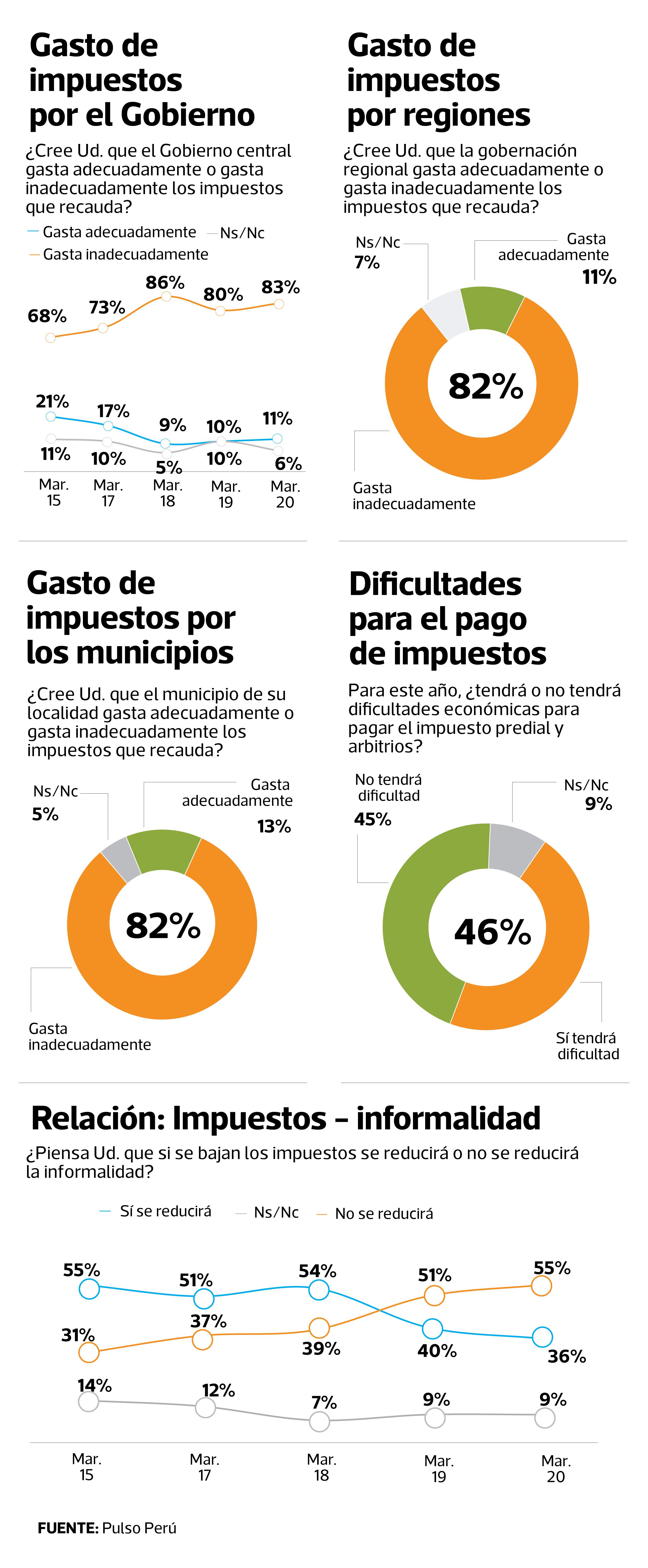 Precisamente, la última encuesta Pulso Perú, de marzo de este año y que elabora Datum, revela que el 83% de los peruanos considera que el Gobierno central gasta inadecuadamente los impuestos que recauda y solo un 11% cree lo contrario (ver gráfico). Esto explicaría en parte por qué la presión tributaria en nuestro país es tan baja (14.4% del PBI en el 2019).