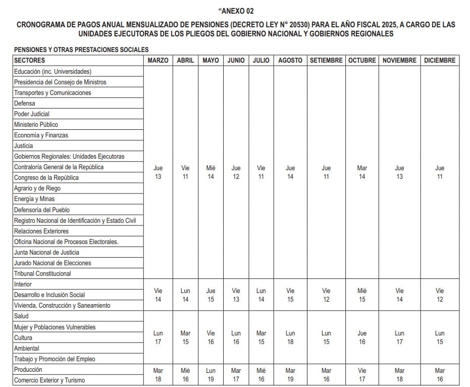 Según normativas publicadas, también se autorizó el cronograma de pagos de las pensiones correspondientes al Decreto Ley 19990, financiadas con cargo al presupuesto de la Oficina de Normalización Previsional (ONP).