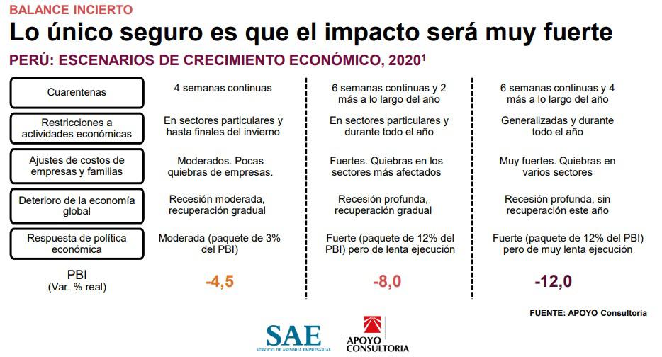 Pero tras la extensión de la cuarentena a 6 semanas, la consultora prevé que esta medida aún podría extenderse por 2 semanas adicionales en cualquier momento del año; en este escenario el PBI caería en 8%.
