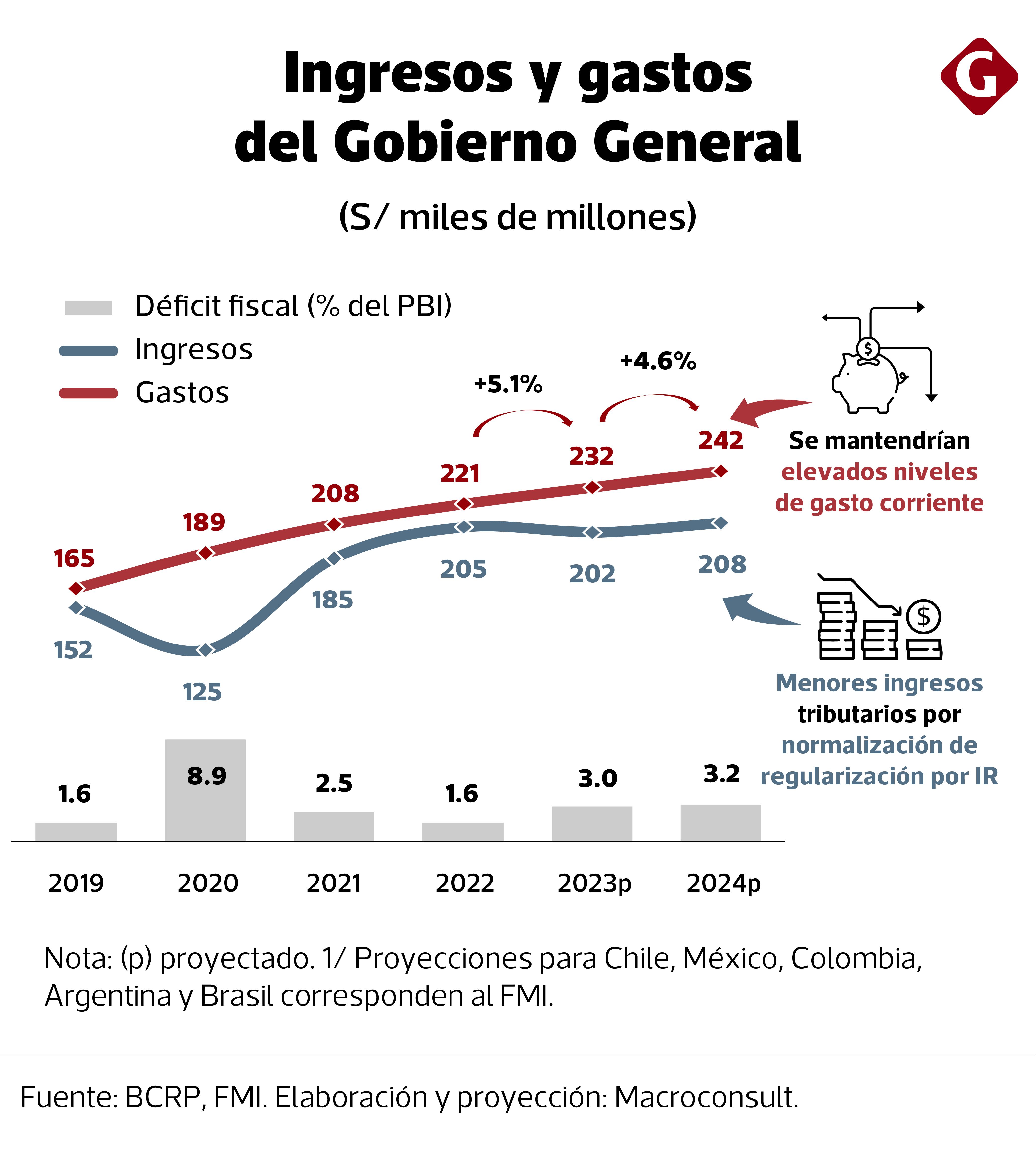 Déficit fiscal. Macroconsult proyecta que sea 3% del PBI este año (la regla fiscal pone como “tope” para el 2023 un 2.4% del PBI). Elmer Cuba subrayó que esto no sería alarmante pues se entiende el contexto: impacto de los conflictos sociales, ciclón Yaku y el fenómeno de El Niño costero, así como el impacto previsto hacia adelante por el fenómeno de El Niño global.