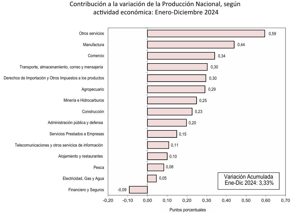 La producción nacional registró un crecimiento de 4.8% en diciembre del 2024, explicado por el desenvolvimiento positivo de casi todos los sectores, a excepción de construcción.