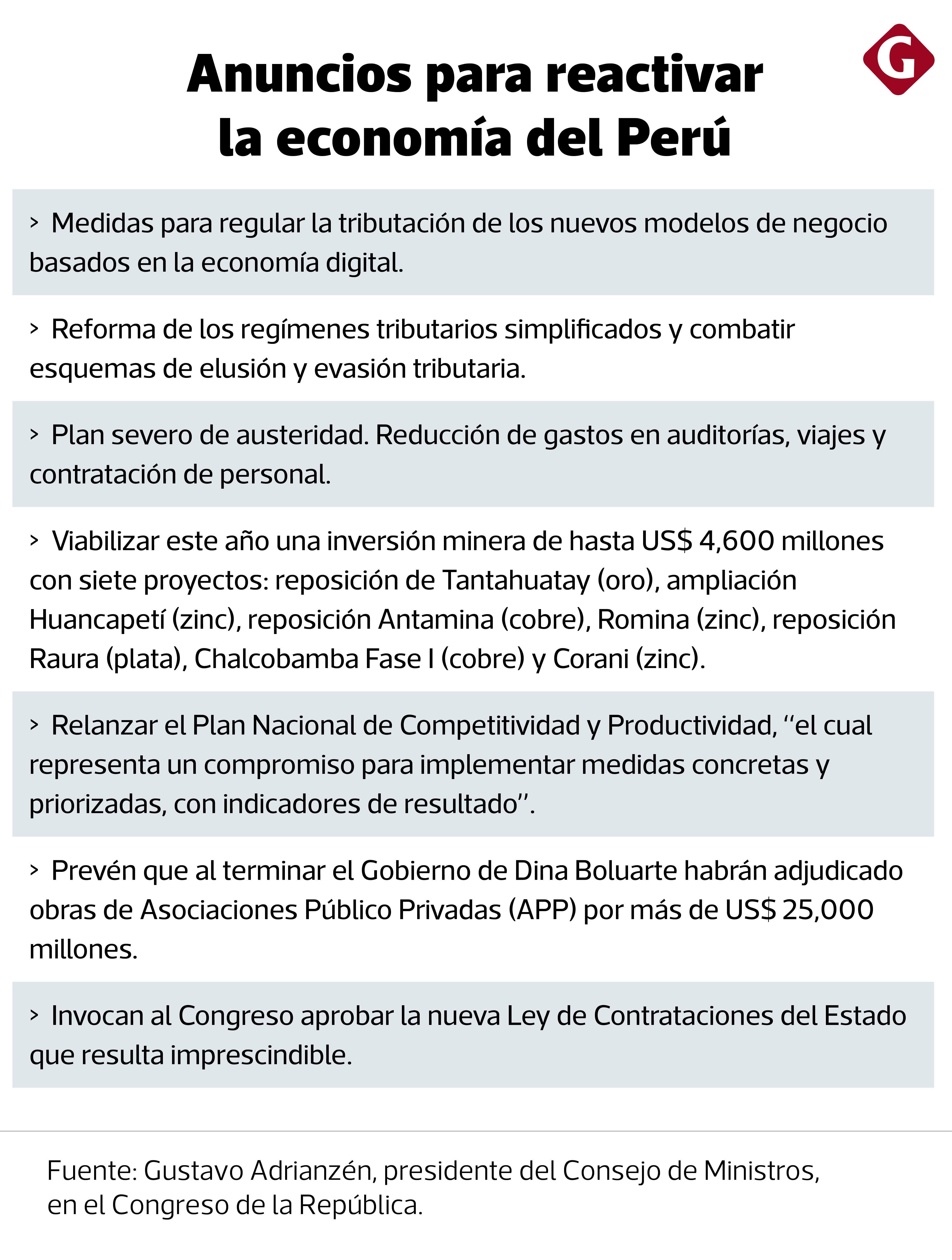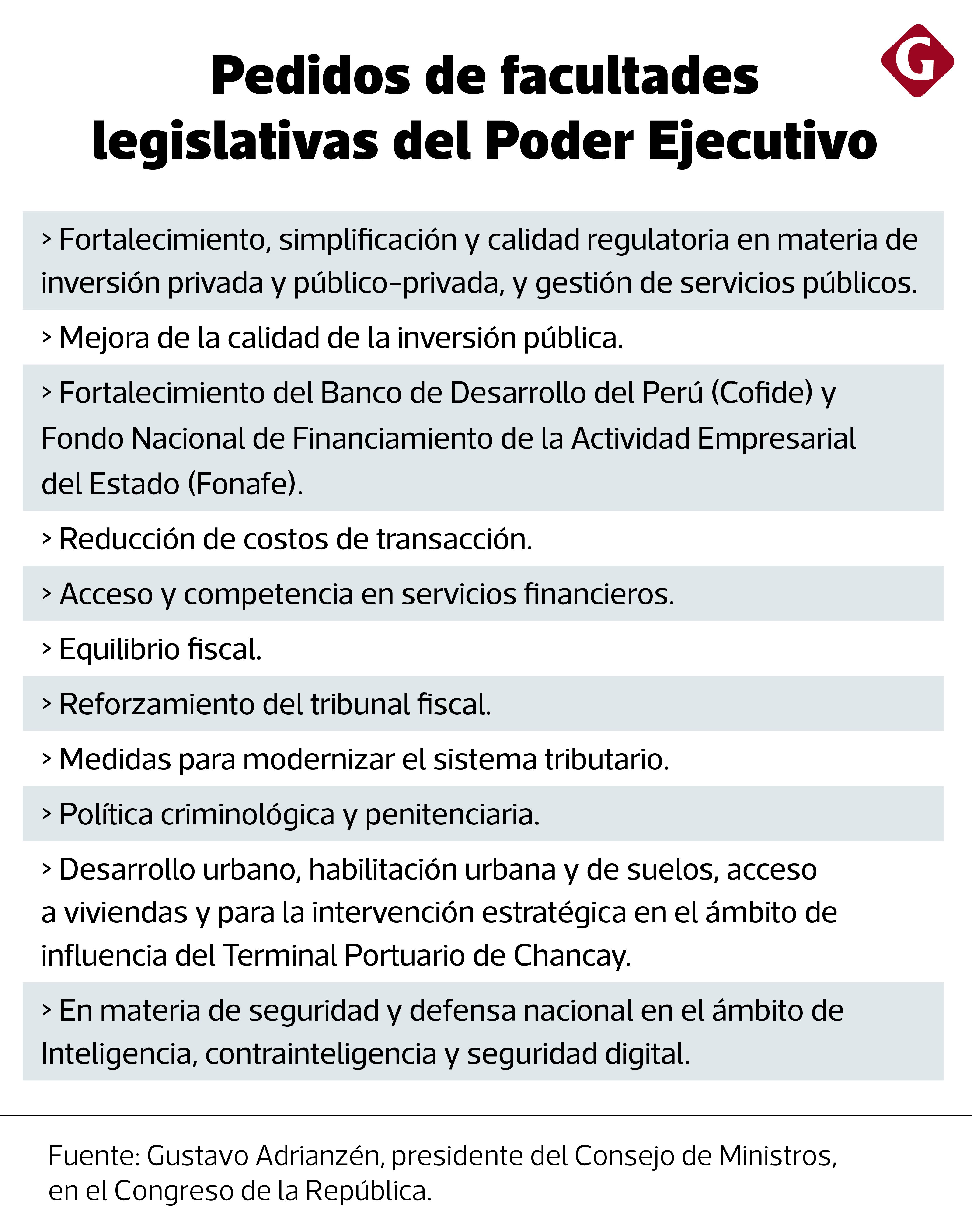 En esa línea de recuperar la economía del país, Gustavo Adrianzén, presidente del Consejo de Ministros, indicó ante el Parlamento -donde acudió para pedir el voto de confianza-, que el pedido del plazo para las facultades legislativas será de 90 días (tres meses).