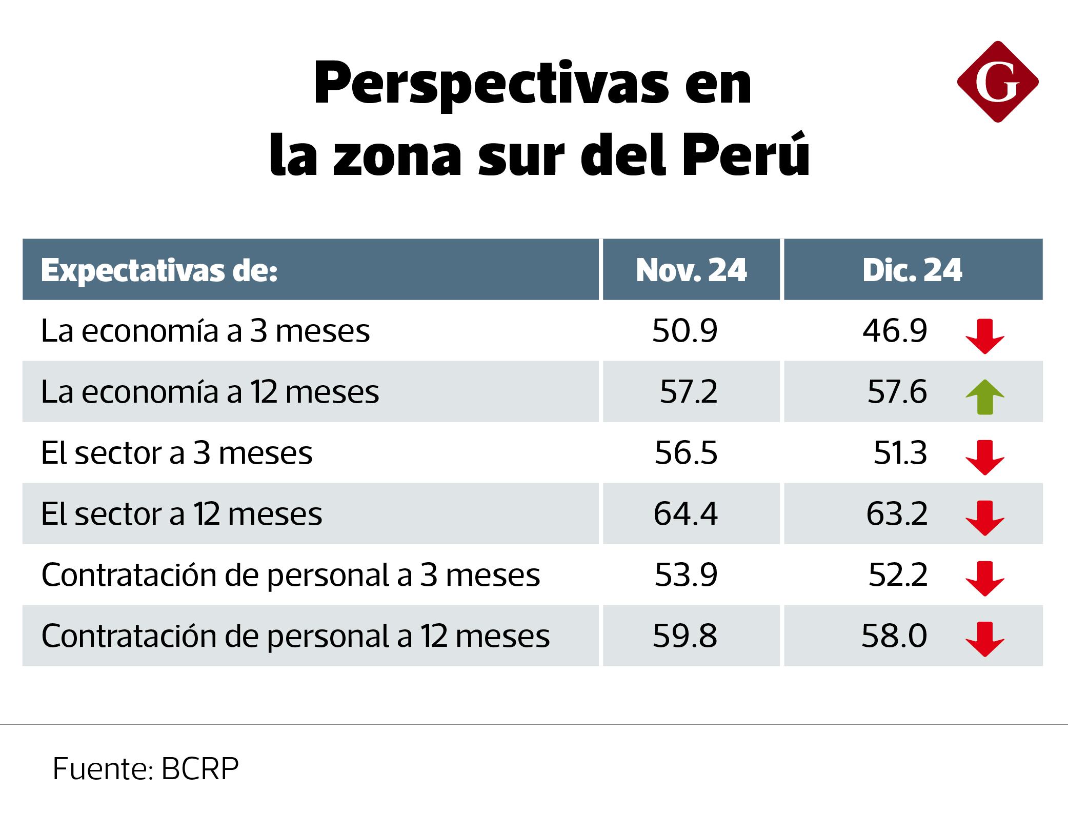 Aunque la Encuesta de Expectativas Macroeconómicas del BCRP mostró que las regiones del sur tienen 16 indicadores en el tramo optimista -tanto de situación actual como de expectativas-, su tendencia general evidencia un deterioro.