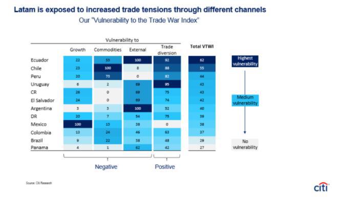 Perú es el tercer país más expuesto en la región a la guerra comercial entre China y Estados Unidos, según Citi Research. Sobre una escala de 100 puntos, en la que la cercanía al 100 revela alta vulnerabilidad, el Perú obtiene 44 puntos, por debajo de Ecuador (62) y Chile (55).